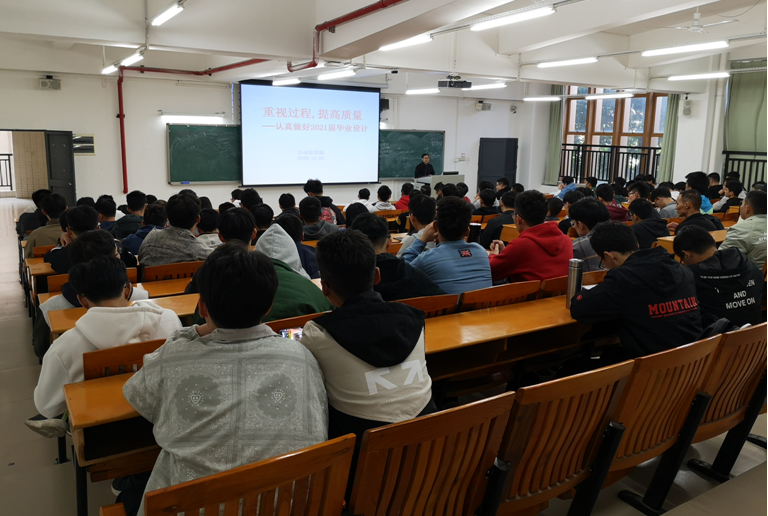 会上,张先勇副院长首先向同学们介绍了毕业设计(论文)的相关流程及要求,并特别指出毕业设计(论文)的重要性。毕业设计不仅关系着每位同学的毕业情况,更是对同学们大学几年所学专业知识的综合运用与能力提升。张院长动员全体同学给予毕业设计(论文)足够重视,协调好毕业设计(论文)与实习工作的关系,保质保量完成任务。他指出,将自己所学的理论知识和实践应用充分结合起来,做好毕业设计(论文),可以作为进入社会的敲门砖。此外,张院长特别强调了学校相关纪律及注意事项,尤其是关于论文抄袭、论文不合格等方面的惩处条例,希望引起同学们的高度重视。