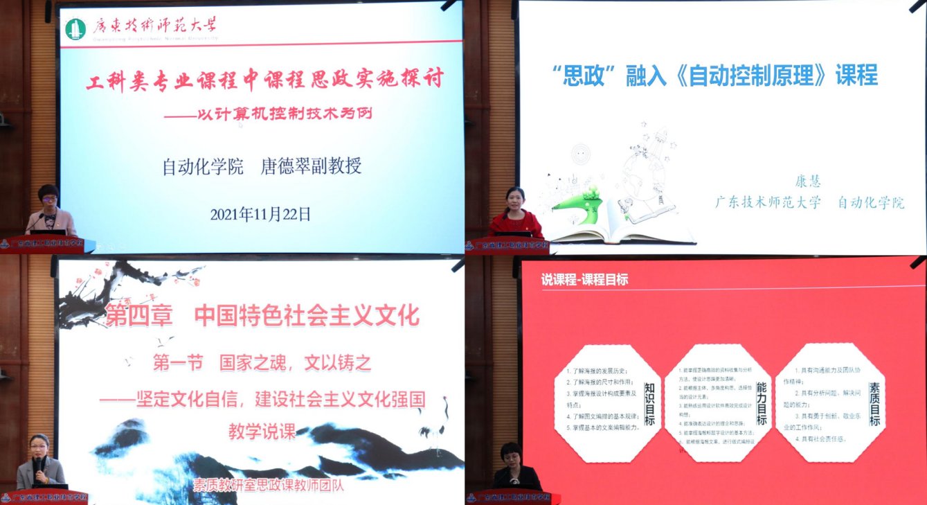 广东省双创样板支部“测控教工党支部”书记、课程思政教学团队核心成员唐德翠副教授从课程思政实施目的、总体指导思想、实施路径与方法、《计算机控制技术》课程思政案例几个维度分享了“工科类专业课程中课程思政如何实施;课程思政教学团队成员康慧博士以“思政”融入《自动控制原理》课程为例,从确立思政教育主题、梳理专业知识点、挖掘思政教学元素、革新思政教学方法及设计思政教学案例详细梳理了贯穿专业课程的课程思政。广东省理工职业技术学校学校万露老师、伍红燕老师结合中专学生特点及市场需求进行了“建党100周年海报设计”、“坚定文化自信,建设社会主义文化强国”说课展示。四位老师发挥各自优势及见解,将思政元素有机地融入专业课堂,起到了“润物细无声”的效果。