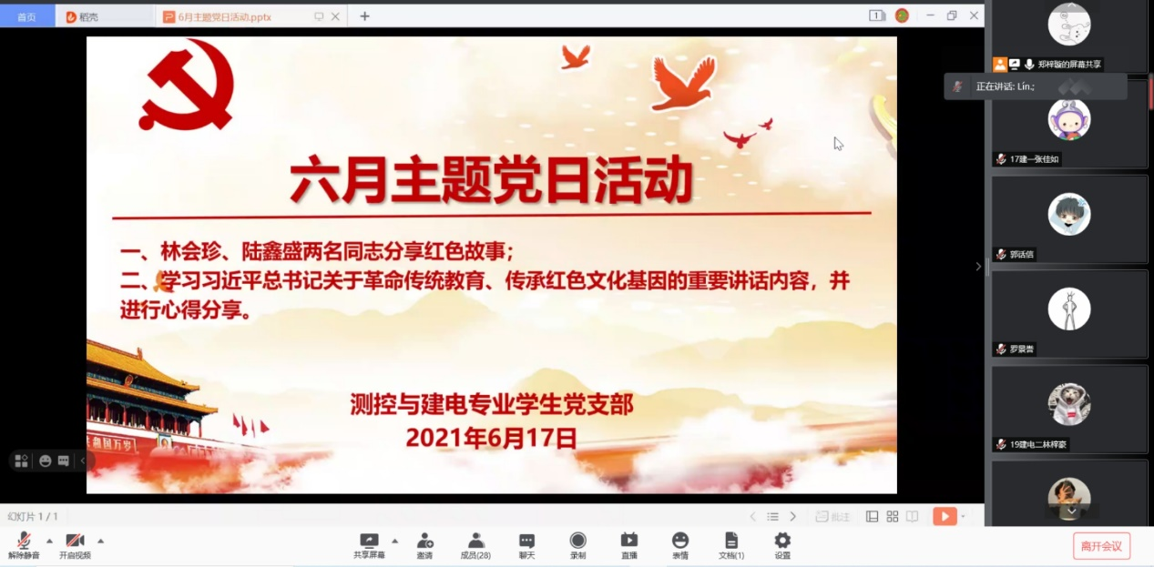 为进一步深入开展党史学习教育,传承红色文化基因,发挥红色资源的重要作用,2021年6月17日晚上18:30,测控与建电专业学生党支部组织全体党员围绕“开展党史学习教育,传承红色文化基因”内容展开学习。
